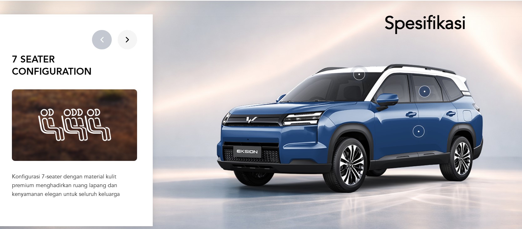 Wuling Eksion termasuk dalam kategori SUV 7-seater. Model ini hadir sebagai SUV yang memadukan karakter tangguh, kabin luas, serta efisiensi energi, sehingga cocok digunakan baik di area perkotaan maupun untuk perjalanan jarak jauh bersama keluarga.